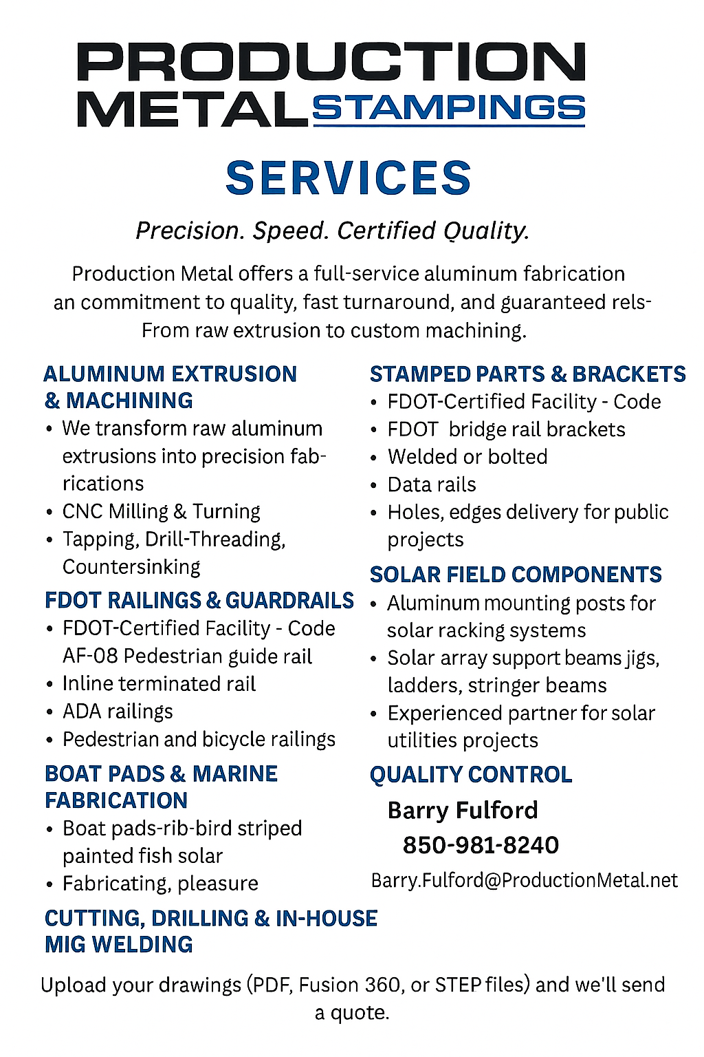 We specialize in delivering fast-turnaround. high-quality aluminum components-from FDOT guardrails and stamped brackets to precision-machined custom parts. Our full-service operation covers everything from raw extrusion to final assembly, all handled right here in Miton, Florida. Whether you’re working on government infrastructure or a custom fabrication project, we’re here to help. Reach out—I’d love to support your next build”